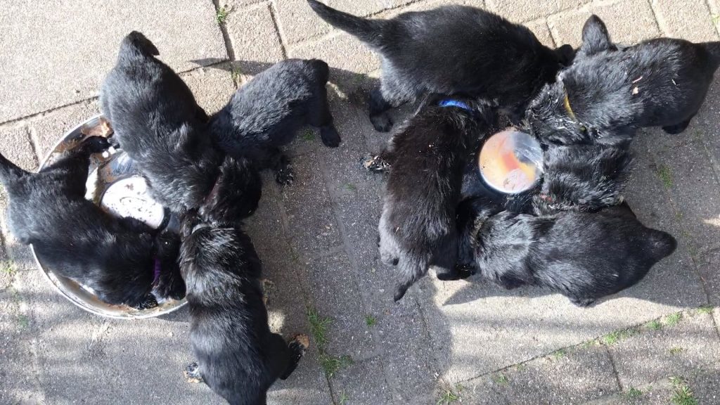 Milchmahlzeiten werden maximal toleriert, dafür ist das Welpenmousse total der Renner. Man sieht zwar hinterher aus wie Schweinchen Babe hoch neun, aber das stört nicht.